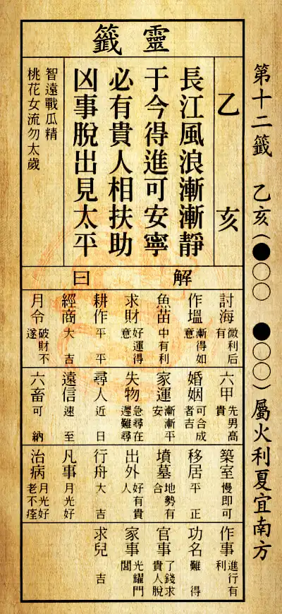 典故【桃花女流勿太歲】 長江的風浪漸漸平靜了,現在船隻可以前進,並且可以安寧無事了,只要積極前進,一定會有貴人來相助,即使遇到困境也能逢凶化吉,化險為夷。【求得此籤】 求得此籤暗示目前福報 平平, 問事求謀先凶後吉,遇貴人才有逢凶化吉之兆。 如有困難,現在慢慢可以化解,不必憂慮,否極泰來,風浪終會過去的。 一生貴人多助,所以常能逢凶化吉。 移居出外旅行,均吉,如問訴訟,可逢貴人而化平安。 問功名,有貴人提拔之兆。 問婚姻,只要謀人出面,婚姻可成。 問疾病, 老危險宜求神消災解厄。 凡事月光好。作事進行有利。家事光耀門閭。家運漸安。婚姻可合成者吉。 求兒吉。六甲先男高貴。求財好運,得意。功名難得。歲君順吉。治病月光好,老不痊。出外有貴人扶。經商大吉。來人近日到。行舟大吉。移居平正。失物急尋在,遲難尋。求雨遠。官事了錢。求貴人脫。六畜可納。耕作平平。築室慢即可。墳墓地勢有合。討海微利後有。作塭漸得如意。魚苗中有利。月令破財不遂。尋人近日。遠信速至。 • 古人:智遠戰瓜精 劉志遠戰瓜精。(劉志遠投軍)桃花女流勿太歲。 |