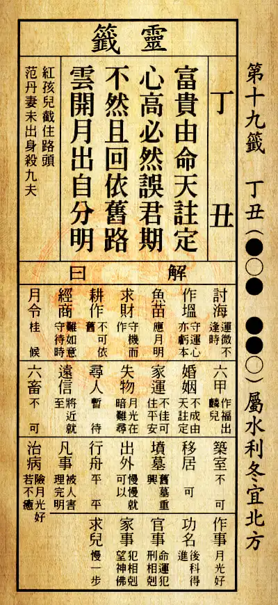 典故【紅孩兒捷住路頭】 俗語說:「富貴在天,生死由命」一個人的窮通禍福,富貴貧賤,都是上天安排命裡註定的,所謂「命裡有時終須有,命裡無時莫強求」如果你期望太高,必定會大失所望,而且耽誤了你的佳期,既然此路不通,何不回頭走舊路,說不定還能撥雲見月,見到光明的遠景呢!【求得此籤】 求得此籤暗示目前福報不夠 .問事求謀,只宜安分守舊 . 不可意氣勉強 . 問事業,創新不吉,守舊安泰。 問求財,不多,財多則身弱,反為不吉。 功名難得,婚姻平平。 移居出外,均不吉。 問疾病,危險有陰邪元辰暗淡,宜消災。 • 凡事被人害,理完(終)明。作事月光好。家事和而貴,犯相剋,望神佛。家運不佳,可住平安。婚姻不成,由天註定。求兒慢一步。六甲先女後男,得貴,作福出麟兒。求財守機而作。功名難得。歲君照舊。治病險,月光好,若暗不癒。出外不可。經商難如意,守待時。來人月頭到。行舟平平。移居可。失物月光在,暗難尋。求雨未有。官事命運犯刑相剋,拖尾。六畜不可。耕作不可依舊。築室不可。墳墓舊墳重興。討海運微不逢時。作塭守運心亦虧本。魚苗應月明。月令桂候。尋人暫待。遠信將近就至。 |