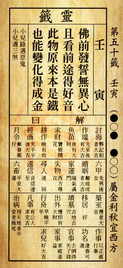 典故【小兒路遇惡鬼】 既然在佛祖前與菩薩面前立下誓言,對佛祖無異心,並對人對是忠心耿耿,那麼此去前途一定會帶回佳音,沒有什麼價值的物品,如今竟能變成如黃金般的一樣值錢。 【求得此籤】 求得此籤暗示你與佛有緣,可得佛降光彩,開脫解厄。 化鐵成金,問求財,莫貪圖目前小利。 問婚姻,須忍耐交往誠實對待,必有收穫。 問功名,目前不如意,加緊用功吧。 問疾病,求神自安 , 醫遇貴人,老人則拖尾危險 。 凡事有公人求完,吉。作事難成。家事家庭進益。家運瑞氣滿門。婚姻難成,成者大吉。求兒好,大吉。六甲男女貴氣,先男後女,男難養,生女好。求財大吉,寶樹開花。功名無。歲君吉。治病祝天地者平安,老拖尾。出外不可(慢即有大財)。經商先平平,後大吉。來人月光到。行舟早晚平平。移居好。失物急尋在(西尋)。求雨及時。官事拖尾(去倒得失了錢)。六畜平安大進。耕作早好晚平。築室慢吉。墳墓吉地吉穴。討海和者大吉。作塭先呆後有大利。魚苗後有大利。月令漸春風好。尋人速回。遠信音信速至。 古人:小兒路遇惡鬼 小兒遇三煞 |
