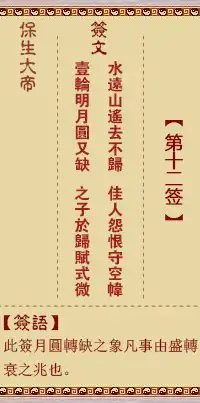 | 籤詩 | 水遠山遙去不歸,佳人怨恨守空幃; 一輪明月圓又缺,之子於歸賦式微。 |
